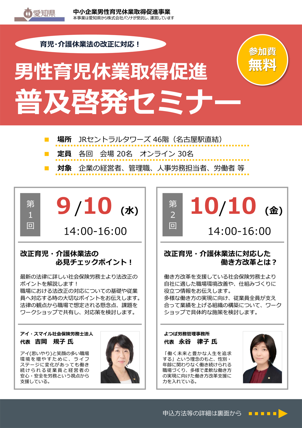 | 2025.8.12 | 【愛知県】男性育児休業取得促進 普及啓発セミナー募集開始!(無料) ↓ ↓ ↓