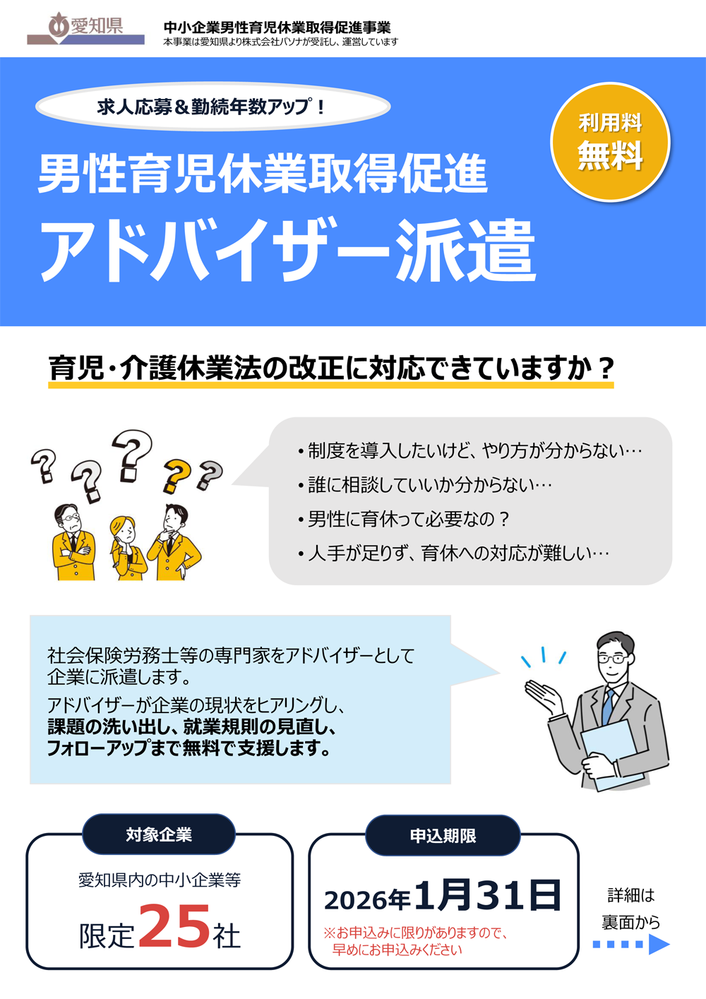 | 2025.7.19 | 【愛知県】男性育児休業取得促進アドバイザー派遣募集開始! 男性も育児休業が取得できる職場環境にすることで、従業員のモチベーションが上がり、組織の活発化につながります。また、採用においても優秀な従業員の確保につながります。 ↓ ↓ ↓ 【事業概要】 |